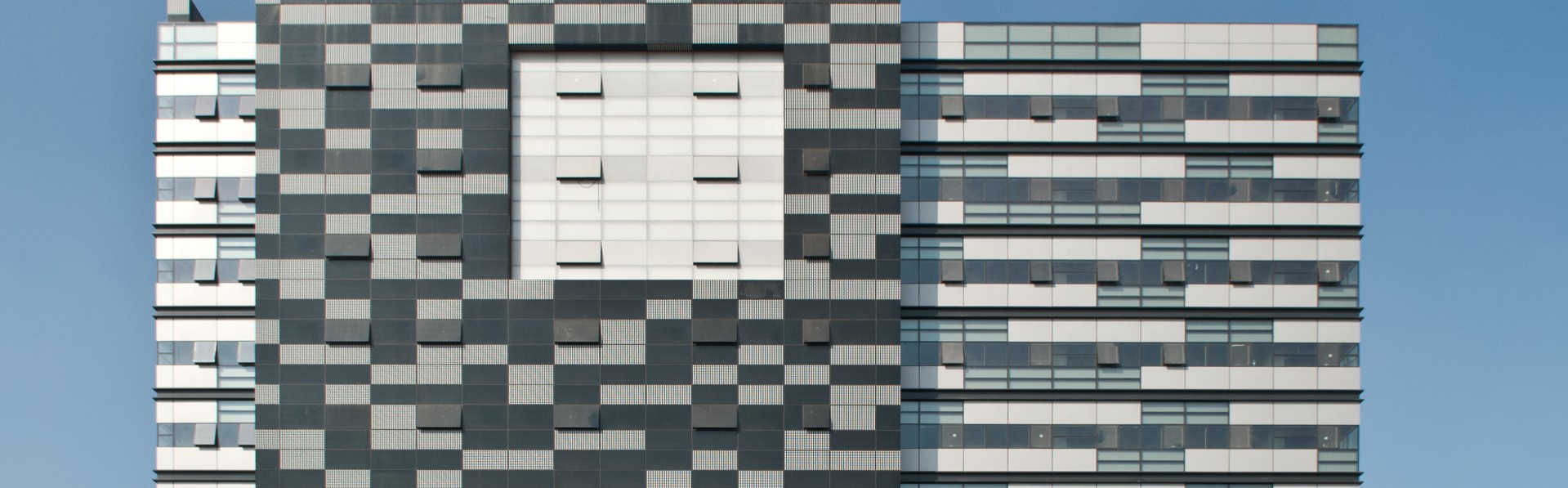The project included curtain walls in the form of asymmetric facades and variable planes that together create a randomized “jigsaw puzzle” of printed glass and metal panels, making it an eye-catching structure in a traditional industrial environment.
