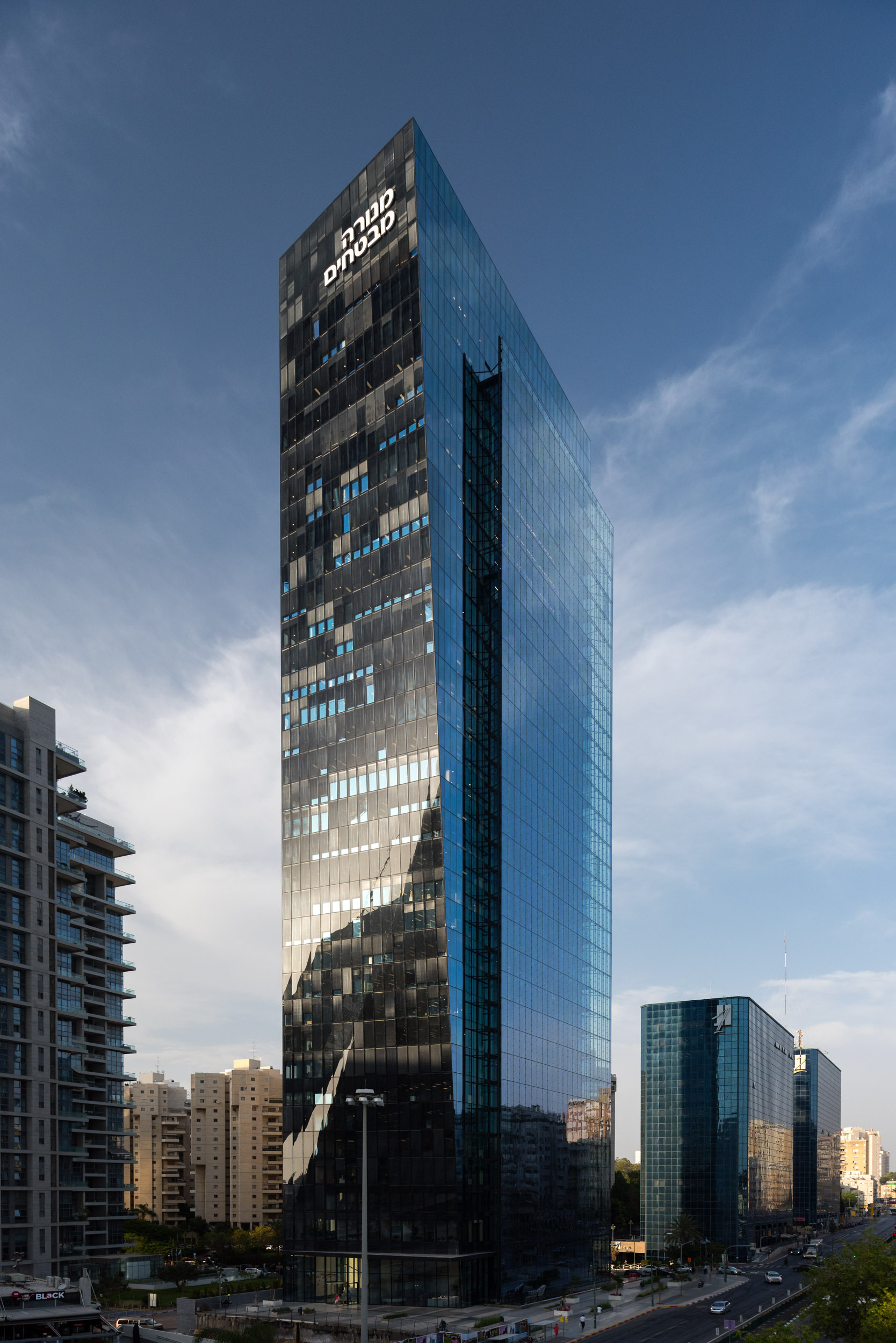 On the western elevation a twisted façade with a climatic double-skin facade system was created, with the outer layer of unitized curtain wall structurally glazed, while each unit bent to 16 mm in diameter to achieve the unique geometry of the facade. On the inside a floor to ceiling system is installed with service doors for the maintenance of the electric blinds installed inside the mechanically ventilated cavity. on the southern façade, a transparent elevator shaft, about 400 tons of steel, which serves both the building elevators and as a sub-construction for the transparent glass wall. The building also boasts a stick system which incorporates glass panes 4 meters in height as well as manual Venetian blinds.
