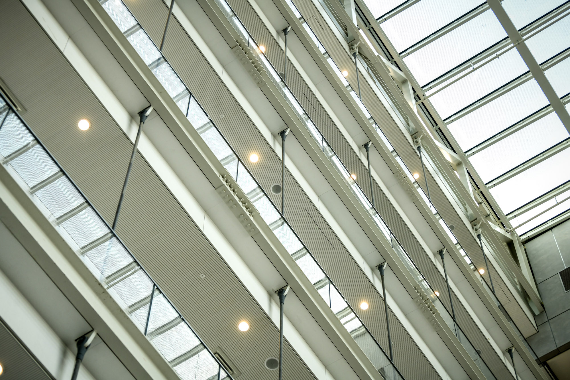 The building envelope incorporates semi-structural glazed curtain walls with hidden windows. In the façade of prefabricated concrete elements we incorporated windows in curtain walls in a clean line with the glass and external concrete. The entire building is installed with Guardian SNX 50/23 glazed glass for excellent thermal control. The atrium is covered with a steel and glass construction hung on the building’s roof, with horizontal shading that provides solar protection with maximum transparency. The building also has a 700m2 Okalux 3D glass skylight above the atrium, the first of its kind in Israel. This glass incorporates a built-in, three-dimensional shading element, which calculates and simulates solar radiation to produce shade and let natural light in by deflecting heat rays from the building as needed during the day, saving energy for air conditioning and lighting.